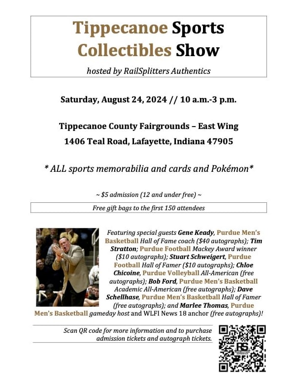 Featuring special guests Gene Keady, Purdue Men’s Basketball Hall of Fame coach ($40 autographs); Tim Stratton; Purdue Football Mackey Award winner ($10 autographs); Stuart Schweigert, Purdue Football Hall of Famer ($10 autographs); Chloe Chicoine, Purdue Volleyball All‐American (free autographs); Bob Ford, Purdue Men’s Basketball Academic All‐American (free autographs); Dave Schellhase, Purdue Men’s Basketball Hall of Famer (free autographs); and Marlee Thomas, Purdue Men’s Basketball gameday host and WLFI News 18 anchor (free autographs)!
